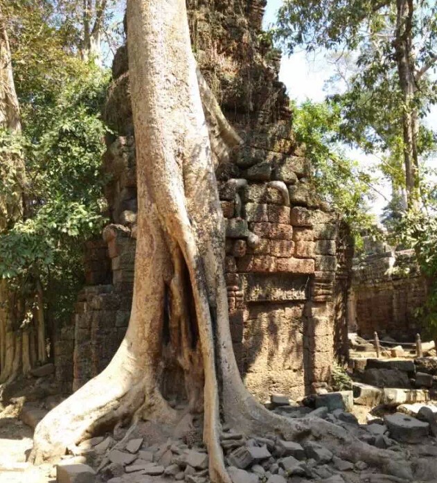 在茶胶寺门口驻足停留了15分钟后,我们匆匆赶往午餐前的最后一个景点--塔普伦寺。这便是好莱坞大片《古墓丽影》的取景地,也是我个人非常喜爱的一个寺庙,喜欢那种沧桑之美。该寺庙的一大亮点,就是整个树竟然长在了墙上,即在建造时就明确不对树木进行任何加工或移植,目的就是彰显自然的力量。