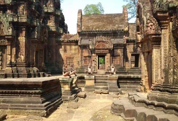 饱餐一顿后,我们乘坐大巴来到了女王宫,它的建筑以小巧玲珑、精致剔透、富丽堂皇而著名于世,有“吴哥古迹明珠”和“吴哥艺术之钻”的美誉,供奉著婆罗门教三大天神之一的湿婆。