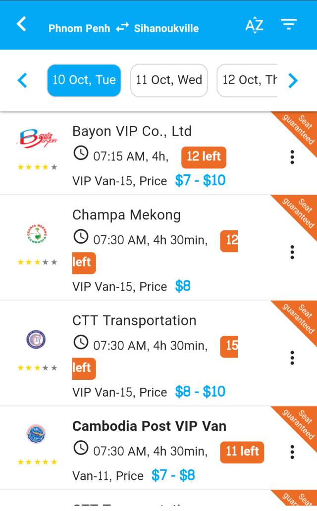 一个预定长途大巴的软件。里面囊括了柬埔寨几乎所有的长途大巴公司的巴士线路。可以用Wing或者是各类信用卡,以及Pay&Go手机钱包进行线上支付。有了这个软件,除了可以即使的订到车票外,还能随时查询长途巴士线路的时刻表,以及各家长途公司的票价情况。部分公司的巴士甚至会在买票后,上门来接你哦!喜欢到处玩的朋友们,赶紧去下载哦。