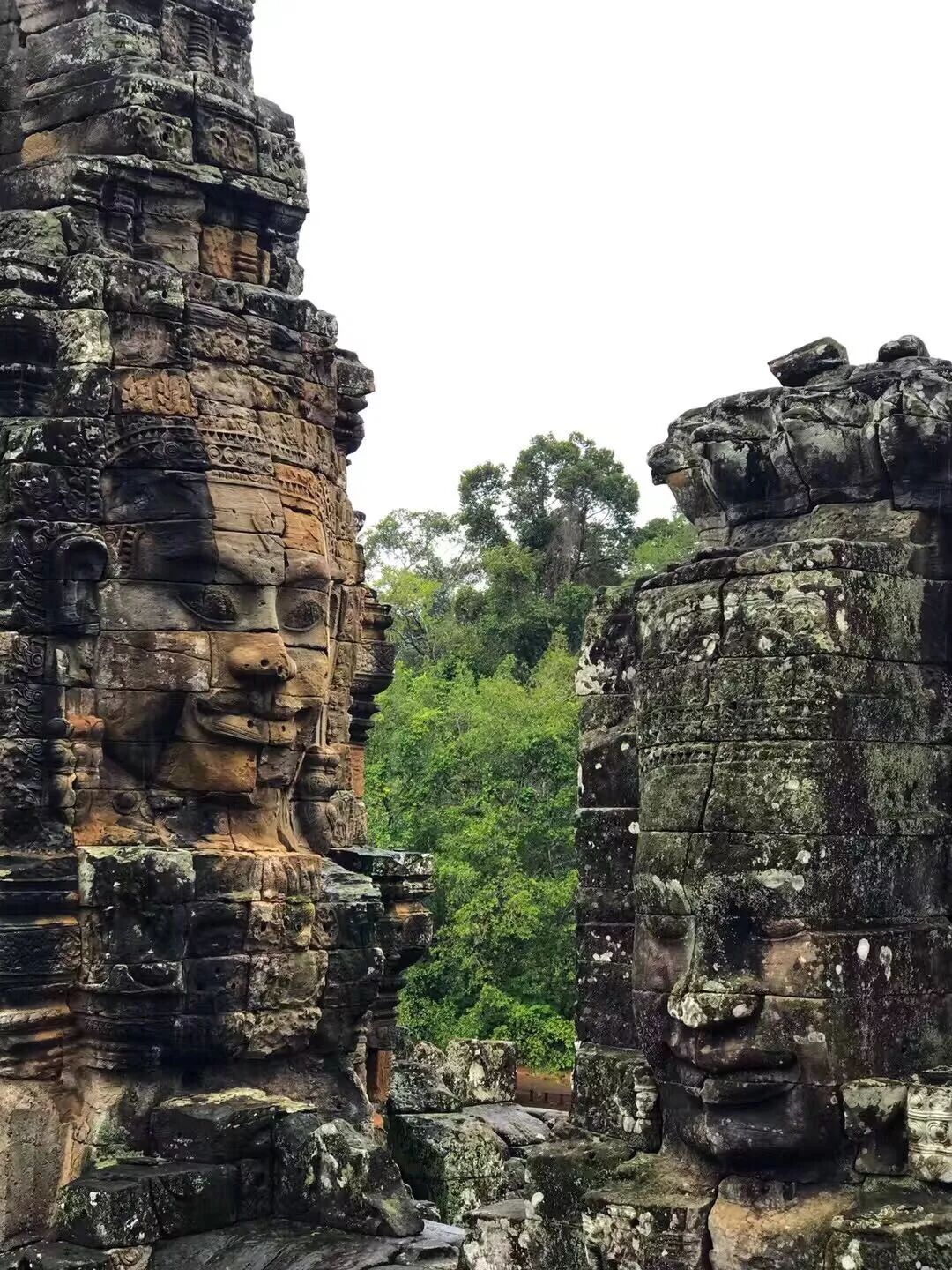 巴戎寺的顶层就是著名的高棉微笑,54座宝塔,每座宝塔四个面,一样的厚嘴唇,嘴角上扬,眼睛微闭,而每面表情又都不那么一样。