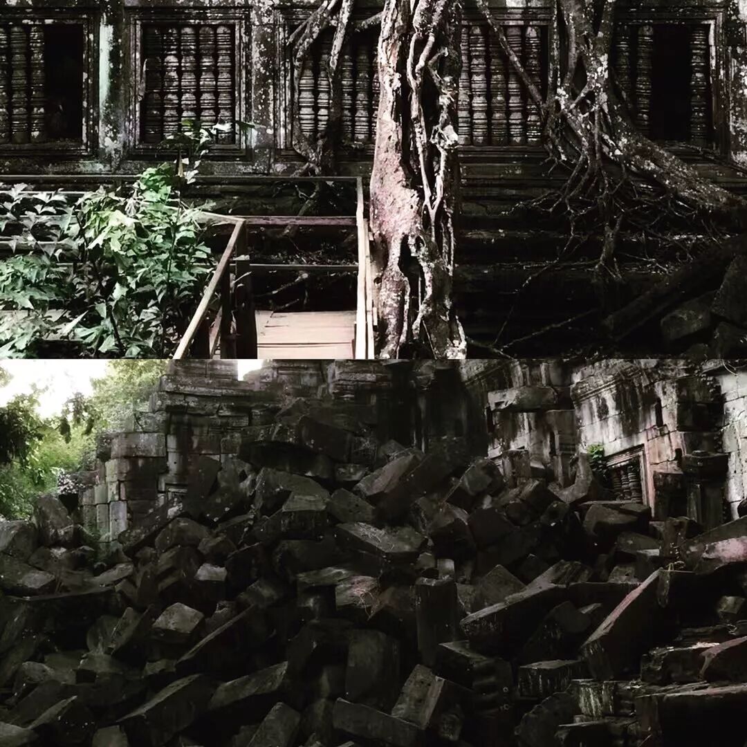 走在撒着抹茶粉的破败宫殿,宛如置身古墓丽影的电影片段。树包着屋,屋包着树。树肆无忌惮地嚣张,庙也安之若素地承受,颓美又不禁让人深思。